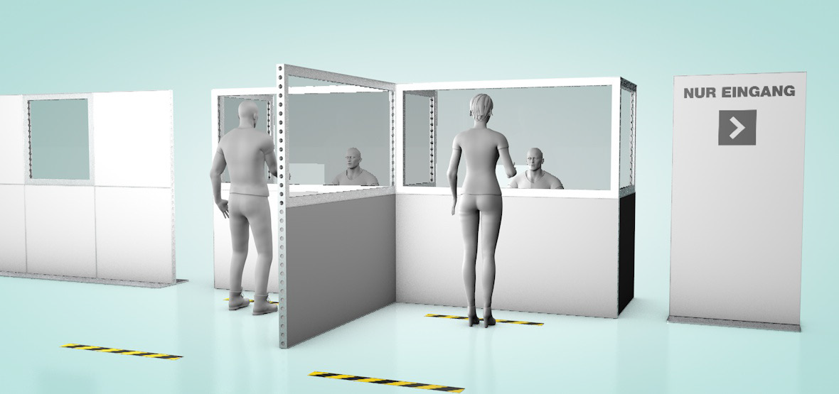 In öffentlichen Einrichtungen, Geschäften oder Orten, an denen viele Personen zusammenkommen, sind oftmals Leitsysteme zur Orientierung, Besucherstromsteuerung und Abstandswahrung sinnvoll bzw. nötig. Mit dem modularen Stelen- und Wandsystem von kompaktraum sind Hinweisschilder und Wandelemente unterschiedlicher Länge einfach und schnell aufgebaut. Sie sind darüber hinaus beliebig erweiterbar und individuell bedruckbar. Zusätzliche Bodenaufkleber, unterstützen die Orientierung und können beispielsweise als Abstandsmarker dienen.